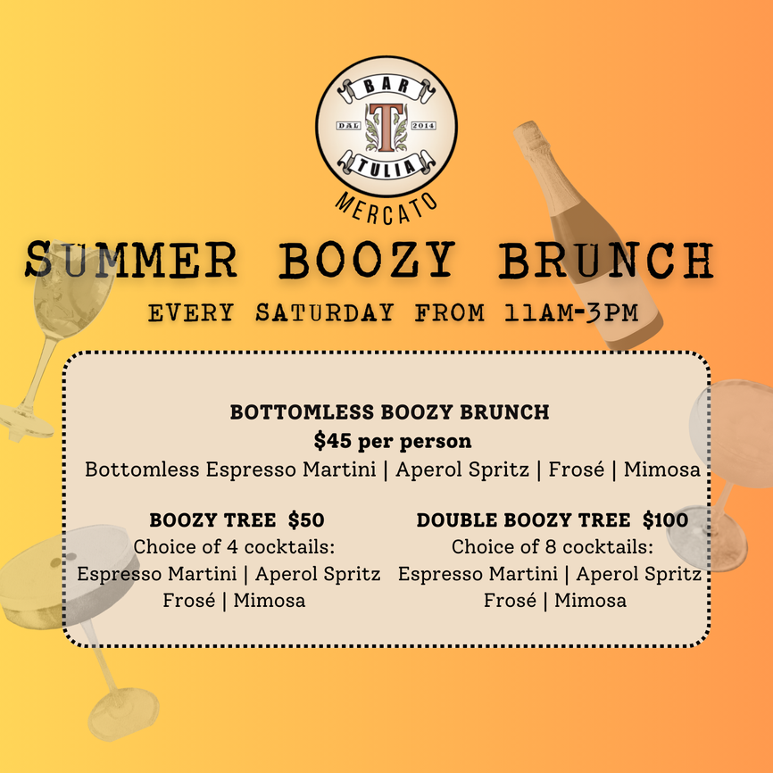 Join us for Boozy Brunch for Bottomless Espressotinis, Aperol Spritz, Frose, Mimosas & Music!!